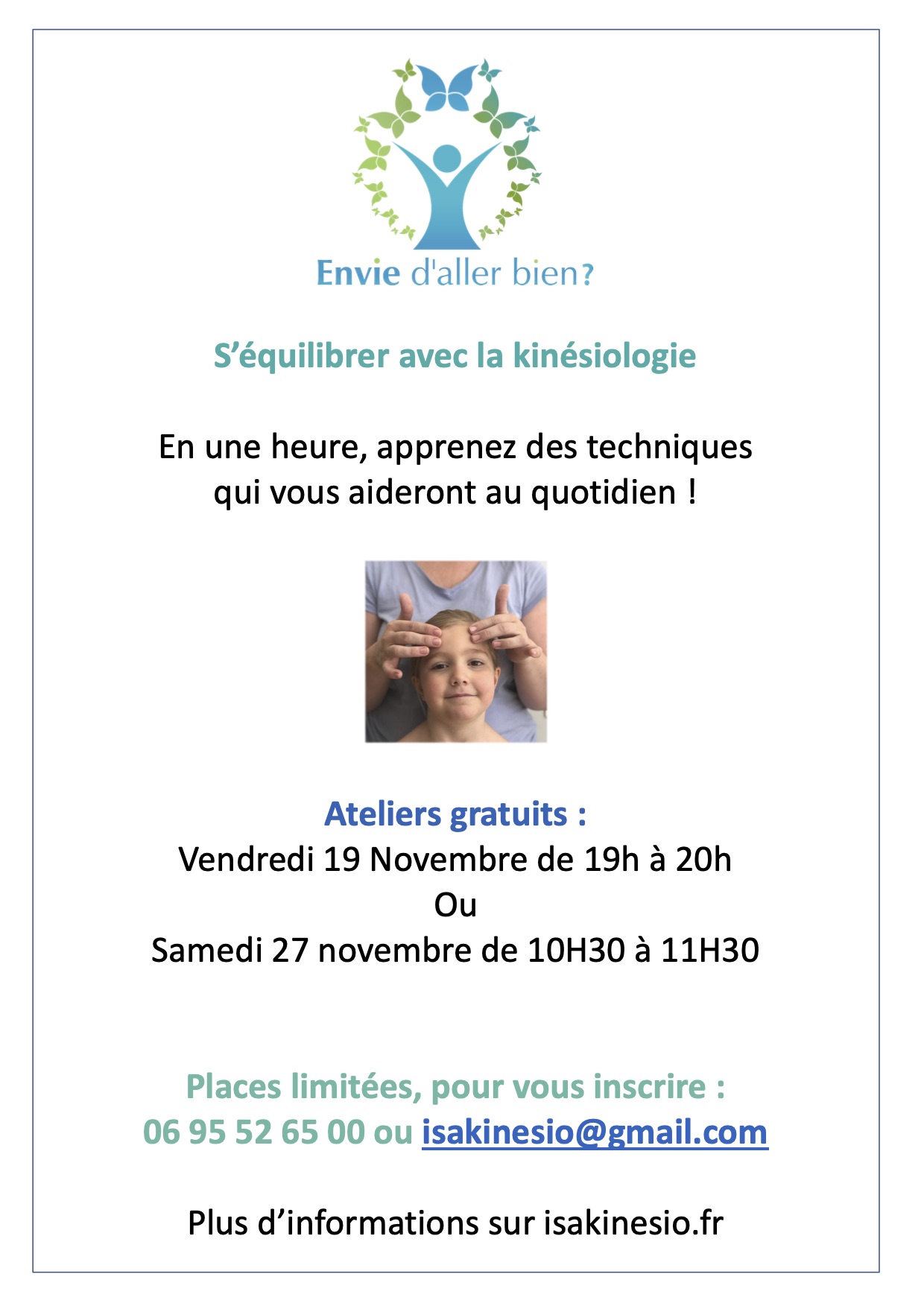 Je vous propose de découvrir la kinésiologie à travers un atelier ludique d’une heure.
