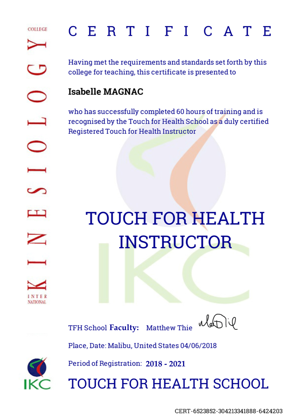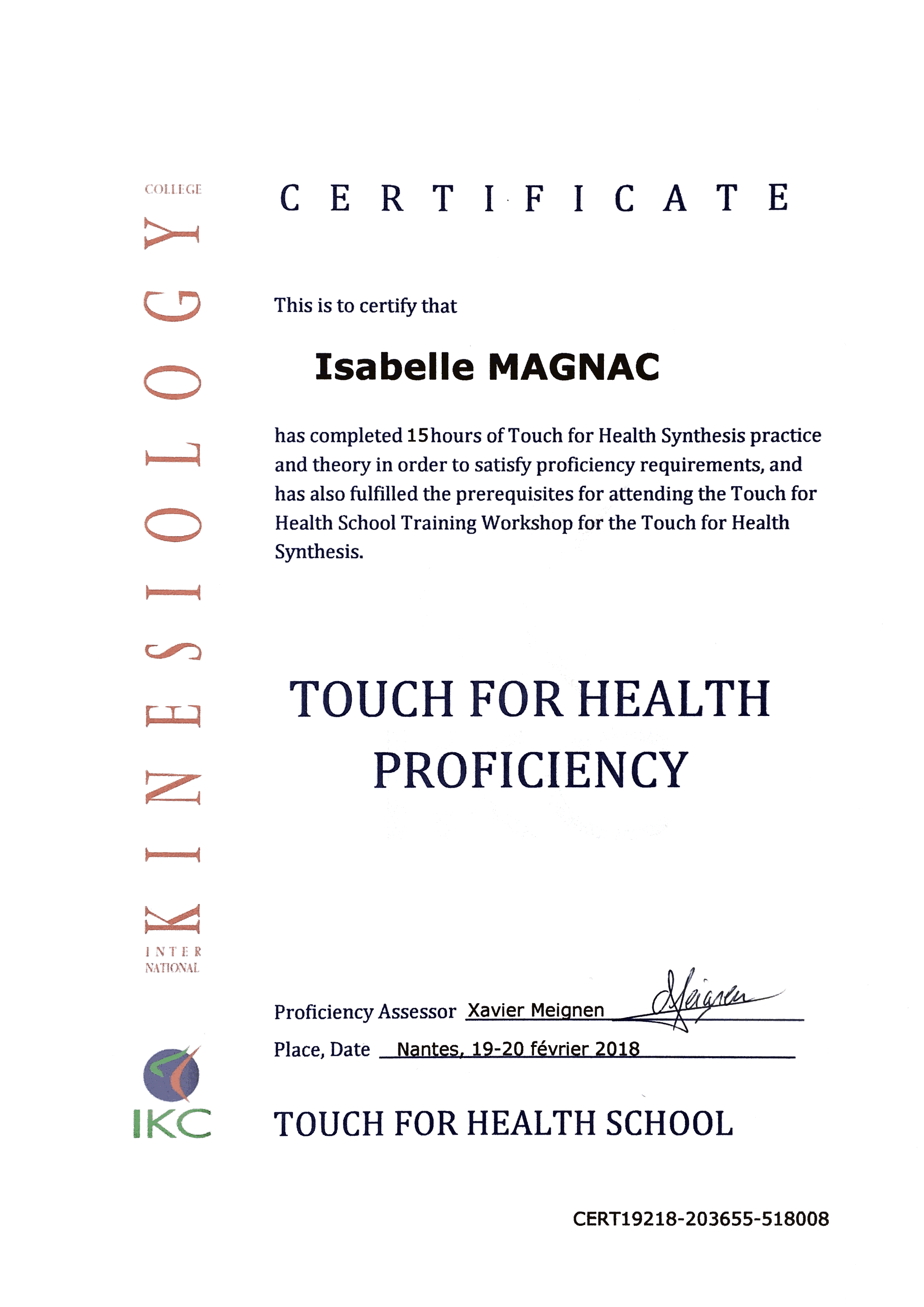 C’est pourquoi je viens d’obtenir le Proficiency, premier niveau de professionnalisation de la Santé par le Toucher !
